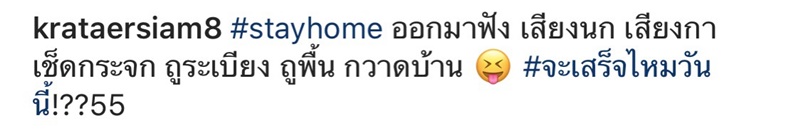 โดยเจ้าตัวโพสต์คลิปและข้อความว่า “#stayhome ออกมาฟัง เสียงนก เสียงกา เช็ดกระจก ถูระเบียง ถูพื้น กวาดบ้าน #จะเสร็จไหมวันนี้!?? 55” งานนี้มีแฟนๆ ไปตอบให้ทันทีว่า “ไม่เสร็จแน่นอน”