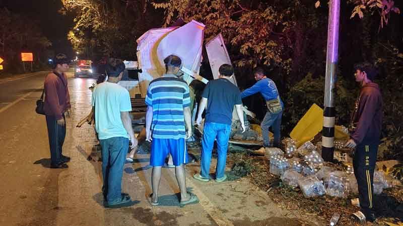 ที่เกิดเหตุพบรถกระบะยี่ห้ออีซูซุ สีขาว 3733 นครพนม พังเสียหายยับเยิน ยางรถล้อหลังซ้ายแบน ท้ายรถดัดแปลงเป็นรถคอก บรรทุกน้ำดื่มยี่ห้อดัง พลิกคว่ำล้อชี้ฟ้ามีนายเกษม อายุ 59 ปี เป็นคนขับ ไม่ได้รับบาดเจ็บแต่อย่างใด