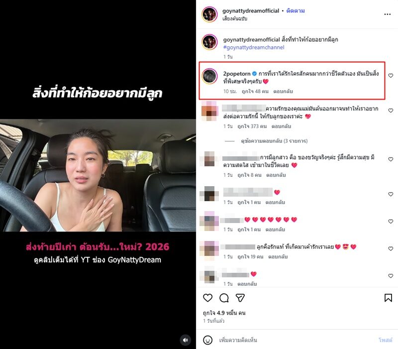 ช่อง goynattydreamofficial โพสต์คลิปจากในรายการของช่องตอนหนึ่งที่ ก้อย อรัชพร ถูกถามเรื่องอยากมีลูกมั้ย ว่า “คำถามที่คนถามมาตลอด อยากมีลูกมั้ย อยากมีลูกมั้ย แล้วก้อยจะชอบแบบว่าแล้วแต่ อยู่ที่แฟนด้วย สามีด้วย ”