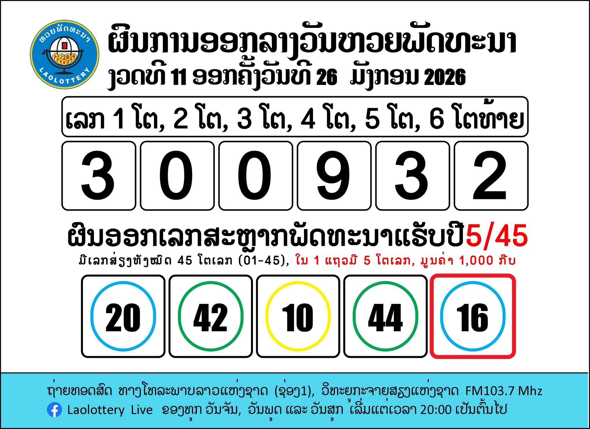 หวยลาววันนี้ งวดประจำวันที่ 26 มกราคม 2569 ผลหวยพัฒนาล่าสุด ตรวจรางวัล หวยลาว ออกอะไร