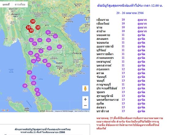 วันที่ 21 เม.ย.2566 กรมอุตุนิยมวิทยา รายงานการคาดหมายดัชนีรังสีอัลตราไวโอเลตล่วงหน้า 7 วัน 25 พื้นที่ ทั่วประเทศไทย โดยระบุว่า ดัชนียูวีสูงสุดกรณีท้องฟ้าโปร่ง เวลา 12.00 น. ระหว่างวันที่ 20-26 เมษายน 2566