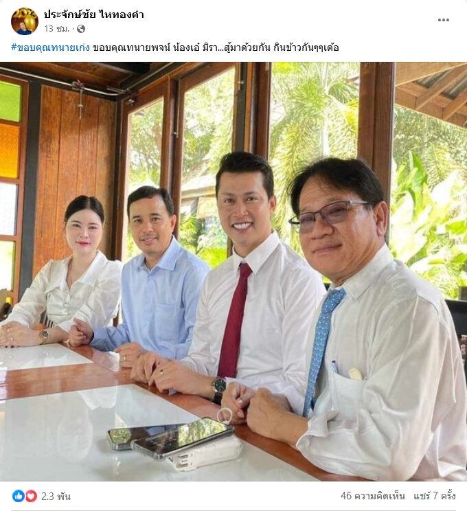 และยังโพสต์ภาพ กับ เอ๋ มิรา และ ทนายเก่ง พร้อมขอบคุณทนายเก่งที่สู้มาด้วยกันว่า “#ขอบคุณทนายเก่ง ขอบคุณทนายพจน์ น้องเอ๋ มิรา…สู้มาด้วยกัน กินข้าวกันๆๆเด้อ”