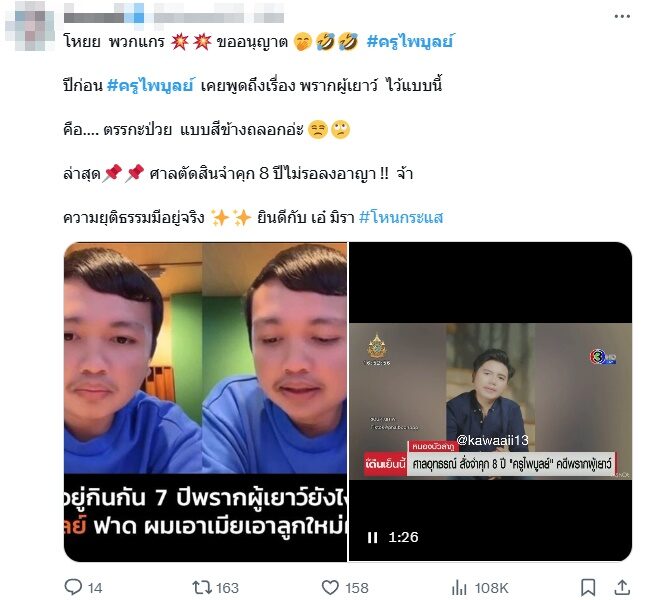 เป็นที่วิพากษ์วิจารณ์ แท็ก #ครูไพบูลย์ ยังคงติดเทรนด์โซเชียล ล่าสุดมีการแชร์คลิป ย้อนฟังคำพูด ครูไพบูลย์ เมื่อปีก่อนที่เคยพูดถึงเรื่อง พรากผู้เยาว์ ทั้งยังถามกลับว่าตัวเอง จะติดคุกข้อหาอะไร โดยถูกวิจารณ์เรื่องตรรกะ เถียงข้างๆคูๆ ไม่ดูข้อกฎหมาย