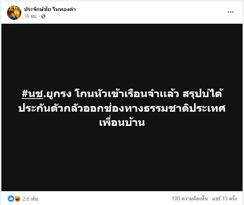 ขณะที่ ประจักษ์ชัย ไหทองคำ นายห้างไหทองคำ โพสต์ข้อความสุดจี๊ดด้วยว่า “#นช.ยูกรง โกนหัวเข้าเรือนจำเเล้ว สรุปบ่ได้ประกันตัวกลัวออกช่องทางธรรมชาติประเทศเพื่อนบ้าน”