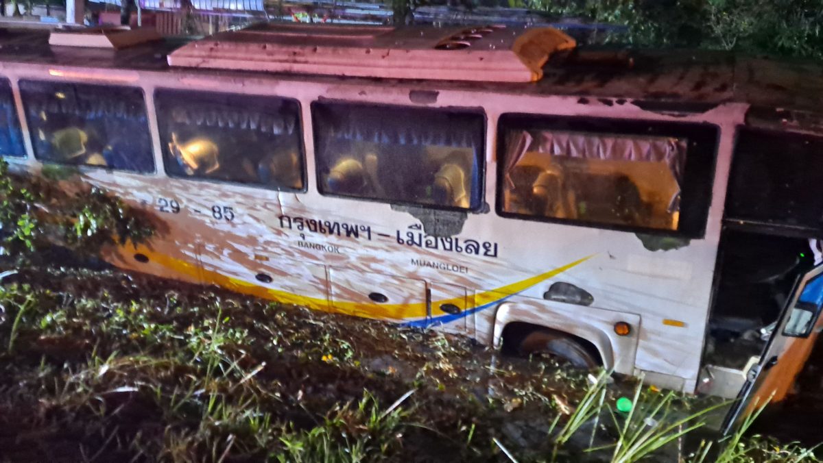 จึงเร่งรุดไปตรวจสอบที่เกิดเหตุ พร้อมหน่วยกู้ภัยสว่างคุณธรรม จ.ชัยภูมิ ในที่เกิดเหตุพบรถทัวร์ปรับอากาศสีขาว ซึ่งเป็นรถร่วม บขส. สายกรุงเทพ- เมืองเลย หมายเลขทะเบียน 10-1991 จ.เลย หมายเลขข้างรถ 29-85 กรุงเทพฯ-เมืองเลย พุ่งลงข้างทางไปชนต้นไม้อยู่ภายในคลองน้ำข้างถนน มีผู้ได้รับบาดเจ็บที่ขาขวา 1 ราย ถูกนำตัวส่ง รพ.ชัยภูมิ และมีผู้โดยสารที่นั่งมากับรถทัวร์คันเกิดเหตุ จำนวนมากร่วมอีก 40 คน ที่ครั้งนี้โชคยังดีไม่ได้ได้รับบาดเจ็บ และพากันหนีออกจากตัวรถหลังเกิดเหตุออกมาได้ทั้งหมด เพื่อมายืนรอการช่วยเหลือให้นำรถทัวร์คันอื่นมารับไปส่งจุดหมายปลายทางที่กรุงเทพฯต่อไป