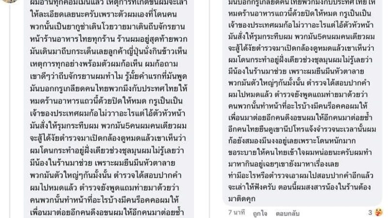 "ผมก็ถามว่า ถีบจักรยานผมทำไม ซึ่งได้รับคำตอบว่า เกลียดคนไทย กลับประเทศไทยให้หมด ร้านอาหารแถวนี้ด้วยปิดให้หมด กูเป็นเจ้าของประเทศ" ต่อมาชายที่ดูเหมือนจะเป็นหัวหน้าสั่งให้รุมกระทืบเจ้าของโพสต์ ซึ่งมากันถึง 5 คนรุมเจ้าของโพสต์เพียงคนเดียว ตำรวจก็เปิดกล้องดูหมดแล้ว เห็นจริงว่าเจ้าของโพสต์โดนกระทำฝ่ายเดียว