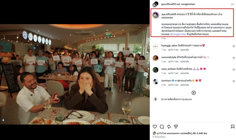 “ครบรอบ 8 ปี ปีนี้ มีว่าที่สามีเป็นของตัวเอง อ้ายยยยยยยยย ขอบคุณทุกคนมากๆ มีความสุขสุดๆ ตื้นตันใจจริงๆ เคยสงสัยมาตลอดทำไมคนเราขอแต่งงานถึงร้องไห้ วันนี้รู้เลยยย หน้าตาเละเทะมาก อบอุ่นสุดๆพร้อมหน้าพร้อมตา มีแต่มวลความรักจากทุกคน และสุดท้ายขอขอบคุณ @vongkumlao ที่อยู่จับมือกันมาตลอด” โดยมีคอมเมนต์ต่างเข้ามาร่วมยินดี