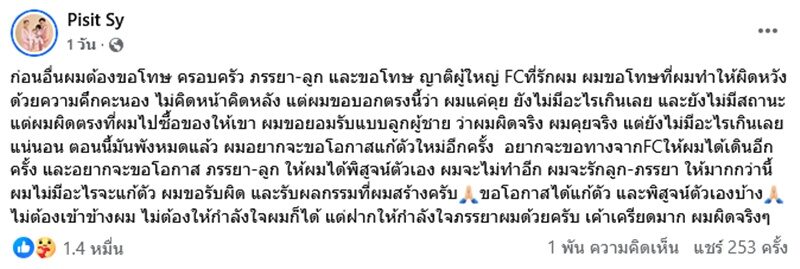“ก่อนอื่นผมต้องขอโทษ ครอบครัว ภรรยา-ลูก และขอโทษ ญาติผู้ใหญ่ FCที่รักผม ผมขอโทษที่ผมทำให้ผิดหวัง ด้วยความคึกคะนอง ไม่คิดหน้าคิดหลัง แต่ผมขอบอกตรงนี้ว่า ผมแค่คุย ยังไม่มีอะไรเกินเลย และยังไม่มีสถานะ แต่ผมผิดตรงที่ผมไปซื้อของให้เขา ผมขอยอมรับแบบลูกผู้ชาย ว่าผมผิดจริง ผมคุยจริง แต่ยังไม่มีอะไรเกินเลยแน่นอน ”
