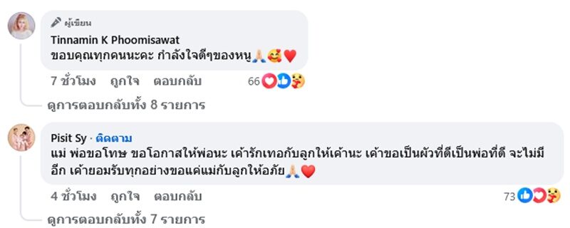 พร้อมทั้งโพสต์ภาพลูกๆ พร้อมข้อความว่า “พ่อรักหนู2คนมากๆนะลูก หนูกับแม่คือลมหายใจพ่อ พ่อขอโทษที่พ่อผิดพลาด ยอมรับว่า พ่อกลัวมาก กลัวตื่นมาไม่เจอหนู2คนกับแม่ บทเรียนราคาแพงนี้พ่อไม่มีวันลืมและจะไม่ทำให้ลูกๆกับแม่เสียใจอีก ขอโอกาสให้พ่อนะ ถึงพ่อจะไม่ใช่พ่อที่ดี แต่พ่อจะทำให้ลูกอยู่ดีกินดี มีการเรียนที่ดี ความเป็นอยู่ที่ดี จนกว่าพ่อจะสิ้นลมหายใจ รักลูกมากที่สุด ขาดลูกไปคงตายเหมือนกัน”