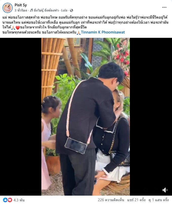 ล่าสุดยังโพสต์คลิปเข้าไปกอดจูบภรรยา พร้อมข้อความขอโอกาสด้วยว่า “แม่ พ่อขอโอกาสสุดท้าย พ่อขอโทษ ยอมรับผิดทุกอย่าง ขอแค่แม่กับลูกอยู่กับพ่อ พ่อไม่รู้ว่าพ่อจะมีชีวิตอยู่ได้นานแค่ไหน แต่พ่อขอใช้เวลาที่เหลือ ดูแลแม่กับลูก เท่าที่พอจะทำได้ พ่อรู้ว่าทุกอย่างต้องใช้เวลา พ่อจะทำมันให้ได้ ขอโทษจากหัวใจ รักเมียกับลูกมากที่สุดชีวิต