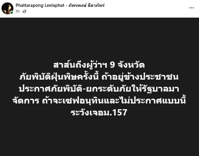ต่อมา สส.ตี๋ โพสต์อีกว่า สาส์นถึงผู้ว่าฯ 9 จังหวัด ภัยพิบัติฝุ่นพิษครั้งนี้ ถ้าอยู่ข้างประชาชน ประกาศภัยพิบัติ-ยกระดับภัยให้รัฐบาลมาจัดการ ถ้าจะเซฟอนุทินและไม่ประกาศแบบนี้ ระวังเจอม.157