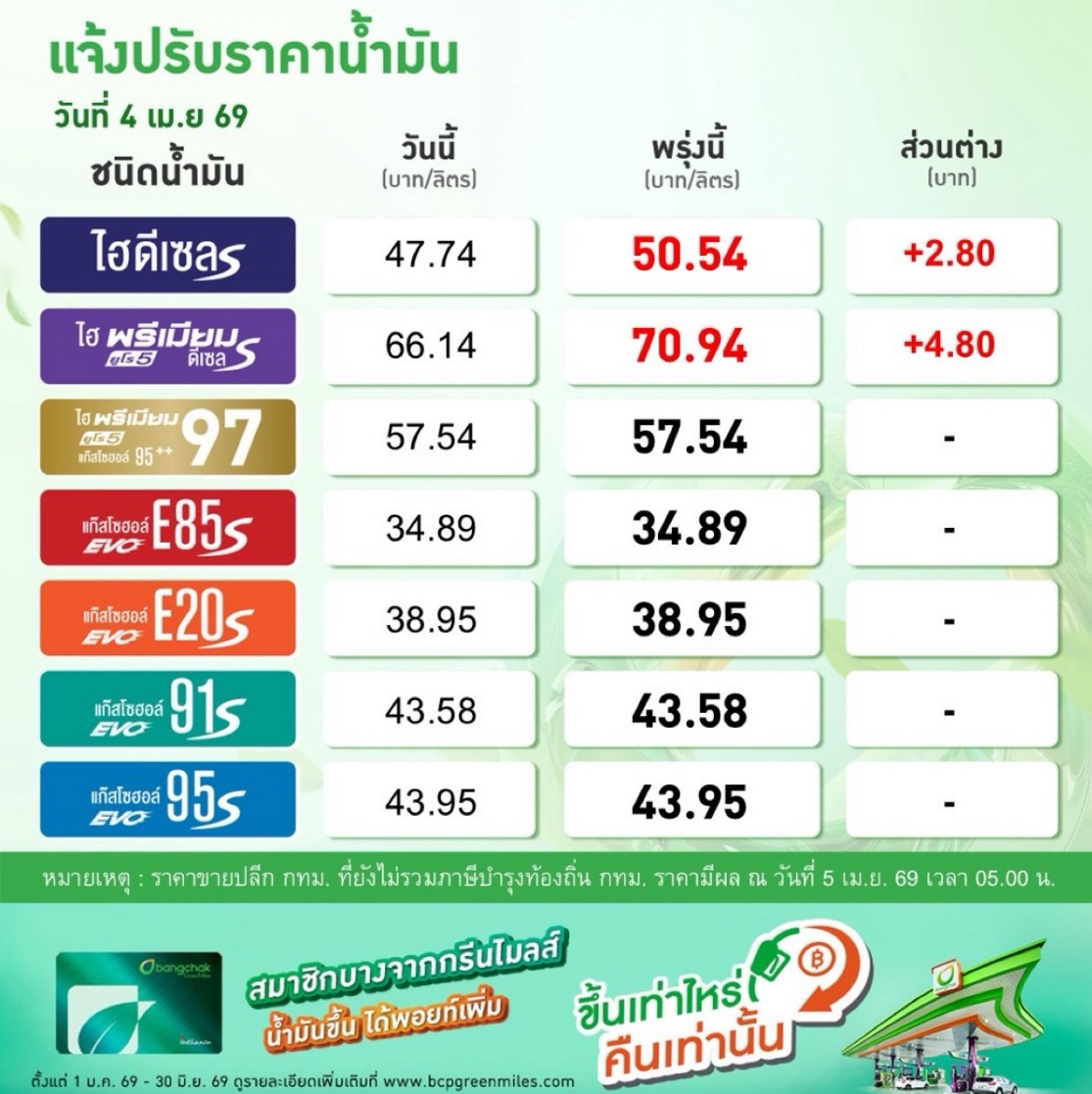ราคาน้ำมันพรุ่งนี้ (5 เม.ย. 2569) ปั๊มน้ำมันประกาศปรับราคาดีเซล ขึ้น 2.80 บาท ดีเซลพรีเมี่ยม ขึ้นสูงสุด 6.50 บาท เบนซิน-แก๊สโซฮอล์ทุกชนิด คงเดิม มีผลตั้งแต่ตี 5 เป็นต้นไป