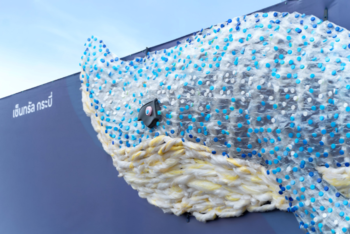 โดยผลงาน Eco-Art Hoarding บนป้ายแนวรั้วโครงการ ‘เซ็นทรัล กระบี่’ สร้างสรรค์จากขยะพลาสติกในทะเลกว่า 3,500 ชิ้น กว่า 360 กิโลกรัม อาทิ ขวด PET, HDPE, PP, ฝาขวด, ถุงพลาสติก, เชือก และเศษอวน โดยออกแบบเป็นภาพสัตว์ทะเลใกล้สูญพันธุ์ในทะเลกระบี่ เช่น วาฬบรูด้า ฉลามวาฬ และเต่ามะเฟือง ขยะพลาสติกทุกชิ้นจะไม่ถูกลงสี แต่เลือกชิ้นที่มีสีใกล้เคียงกับสัตว์ทะเล เพื่อสะดวกต่อการอัพไซเคิลหลังโครงการเสร็จสิ้น สะท้อนความมุ่งมั่นที่จะทำให้ทะเลกระบี่และชีวิตผู้คนดีขึ้น ตามข้อความ ‘For a Better Sea, For a Better Life’ ที่ปรากฏบนผลงาน เพื่อสร้างแรงบันดาลใจในการอนุรักษ์สิ่งแวดล้อมและส่งเสริมการท่องเที่ยวอย่างยั่งยืน พร้อมตอกย้ำความมุ่งมั่นของเซ็นทรัลพัฒนาในการสร้างความยั่งยืนในทุกขั้นตอนของโครงการ