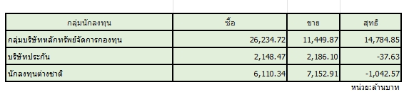 สมาคมตลาดตราสารหนี้ไทย (ThaiBMA) สรุปภาวะตลาดตราสารหนี้ไทยประจำวันนี้ มีมูลค่าการซื้อขายรวมทั้งวันอยู่ที่ 102,169 ล้านบาท ด้านประเภทของนักลงทุน ที่มีมูลค่าการซื้อขายสูงที่สุด 2 อันดับแรก คือ 1. กลุ่มบริษัทหลักทรัพย์จัดการกองทุน (บลจ.) ซื้อสุทธิ 14,785 ล้านบาท 2. กลุ่มบริษัทประกัน ขายสุทธิ 38 ล้านบาท ในขณะที่นักลงทุนต่างชาติ ขายสุทธิ 1,043 ล้านบาท