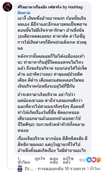ด้านเพจพี่โลมาฯ ก็คอมเมนต์เพิ่มเติมด้วยว่า “เอางี้ เงินหนึ่งล้านบาทแรก ก้อนนั้นเงินผมเอง มีอีจ่าและอีกหลายคนเป็นพยาน ตอนนั้นไม่มีเงินจ่าค่ารักษา ล้านนึงนั่น วูบเดียวหมดเลยนะ ค่าผ่าตัด ค่าไอซียู การใช้เงินต่างๆก็มีคนช่วยสังเกต ช่วยดูแล หลังจากนั้นคุณแม่ก็ไม่ได้งอมืองอเท้านะ ทำมาหากินสู้ชีวิตตลอดจนไม่ไหวแล้ว ถึงขอรับบริจาค รอบก่อนได้ไปเจ็ดล้าน อย่าคิดว่าเยอะ ค่าดูแลผู้ป่วยติดเตียง ตีต่ำๆ เดือนละแสนเผลอๆไม่พอ เงินบริจาคก้อนนึงจะอยู่ได้กี่ปีกัน ถ้าจะดราม่าเงินบริจาค อย่าไปว่าแม่น้องเขาเลย ด่าอีจ่าเล่นแทนดีกว่า และที่ควรไปด่าแบบจริงๆจังๆ คือคนที่ทำให้เกิดเรื่องวันนี้ขึ้น ติดคุกหน่อยเดียวออกมาแล้วลอยหน้าลอยตาใช้ชีวิตดีๆอ่ะ รบกวนหัวหน้าทัวร์ทั้งหลายหน่อย