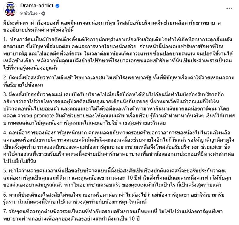 ด้านเพจ Drama-addict ก็โพสต์ถึงเรื่องนี้ว่า“มีประเด็นดราม่าเรื่องของที่ แอดมินเพจแม่น้องการ์ตูน โพสต์ขอรับบริจาคเงินช่วยเหลือค่ารักษาพยาบาล”