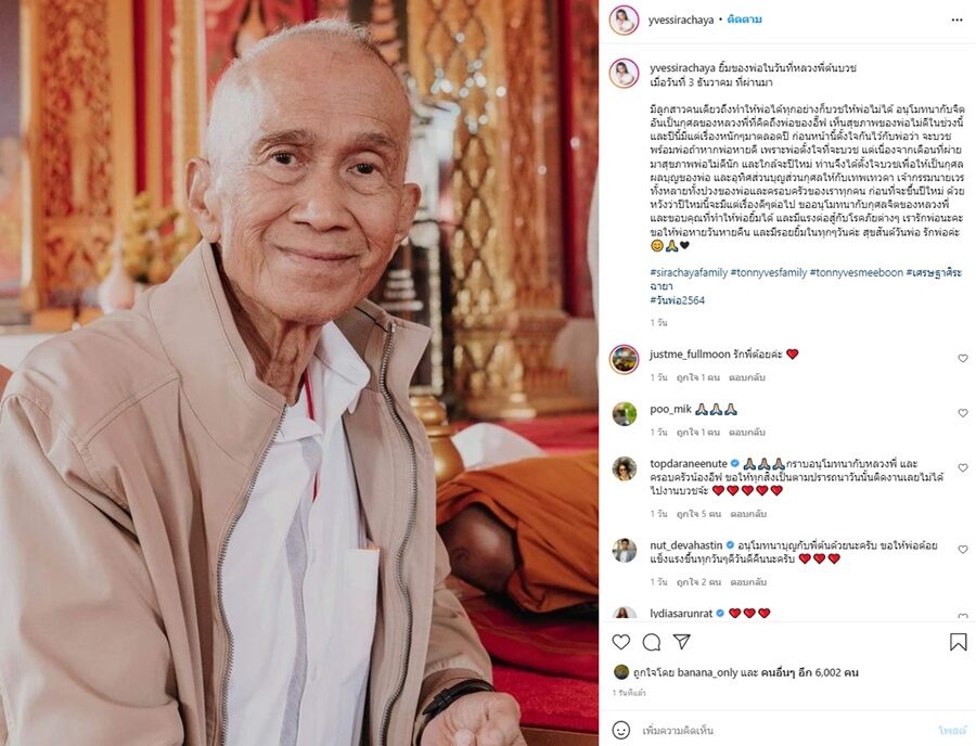 พร้อมทั้งยังเผยโมเมนต์สุดอบอุ่นพระต้นจับมือกับพ่อต้อย เศรษฐา พร้อมทั้งบอกอีกว่า มีลูกสาวคนเดียวถึงทำให้พ่อได้ทุกอย่างก็บวชให้พ่อไม่ได้ อนุโมทนากับจิตอันเป็นกุศลของหลวงพี่ที่คิดถึงพ่อของอี๊ฟ เห็นสุขภาพของพ่อไม่ดีในช่วงนี้ และปีนี้มีแต่เรื่องหนักๆมาตลอดปี ก่อนหน้านี้ตั้งใจกันไว้กับพ่อว่า จะบวชพร้อมพ่อถ้าหากพ่อหายดี เพราะพ่อตั้งใจที่จะบวช แต่เนื่องจากเดือนที่ผ่ายมาสุขภาพพ่อไม่ดีนัก และใกล้จะปีใหม่ ท่านจึงได้ตั้งใจบวชเพื่อให้เป็นกุศลผลบุญของพ่อ และอุทิศส่วนบุญส่วนกุศลให้กับเทพเทวดา เจ้ากรรมนายเวร ทั้งหลายทั้งปวงของพ่อและครอบครัวของเราทุกคน ก่อนที่จะขึ้นปีใหม่ ด้วยหวังว่าปีใหม่นี้จะมีแต่เรื่องดีๆต่อไป ขออนุโมทนากับกุศลจิตของหลวงพี่ และขอบคุณที่ทำให้พ่อยิ้มได้ และมีแรงต่อสู้กับโรคภัยต่างๆ เรารักพ่อนะคะ ขอให้พ่อหายวันหายคืน และมีรอยยิ้มในทุกๆวันค่ะ สุขสันต์วันพ่อ รักพ่อค่ะ #sirachayafamily #tonnyvesmeeboon #tonnyvesfamily #เศรษฐาศิระฉายา #3ธันวาคม2564 #วันพ่อ2564