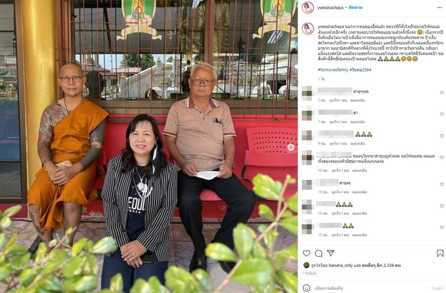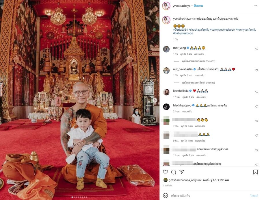 อี๊ฟ ยังเผยภาพพระต้นกับโยมพ่อแม่ พร้อมทั้งบอกด้วยว่า นอกจากพ่อของอี๊ฟแล้ว หลวงพี่ก็ตั้งใจที่จะบวชให้พ่อแม่ตัวเองด้วยอีกครั้ง (เพราะเคยบวชให้พ่อแม่มาแล้วครั้งนึงค่ะ ) เนื่องจากปีนี้เพิ่งเมื่อไม่นานป๊าเพิ่งมีอาการหมอนรองกระดูกทับเส้นประสาท ป๊าเจ็บสะโพกลงไปถึงขา และขาไม่ค่อยมีแรง และปีนี้ครอบครัวก็เจอแต่เรื่องหนักๆมามาก ขออานิสงส์ที่หลวงพี่ตั้งใจบวชนี้ ทำให้ป๊าหายวันหายคืน กลับมาแข็งแรงสดใส และมีความสุขทั้งกายและใจนะคะ กราบสวัสดีวันพ่อค่ะป๊า ขอสิ่งศักดิ์สิทธิ์คุ้มครองป๊าตลอดไปค่ะ #tonnyvesfamily #วันพ่อ2564 รวมทั้งยังมีโมเมนต์เอ็นดูน้องมีบุญกับพระพ่อต้นด้วย พร้อมแคปชั่นว่า หลวงพ่อของมีบุญ และมีบุญของหลวงพ่อ
