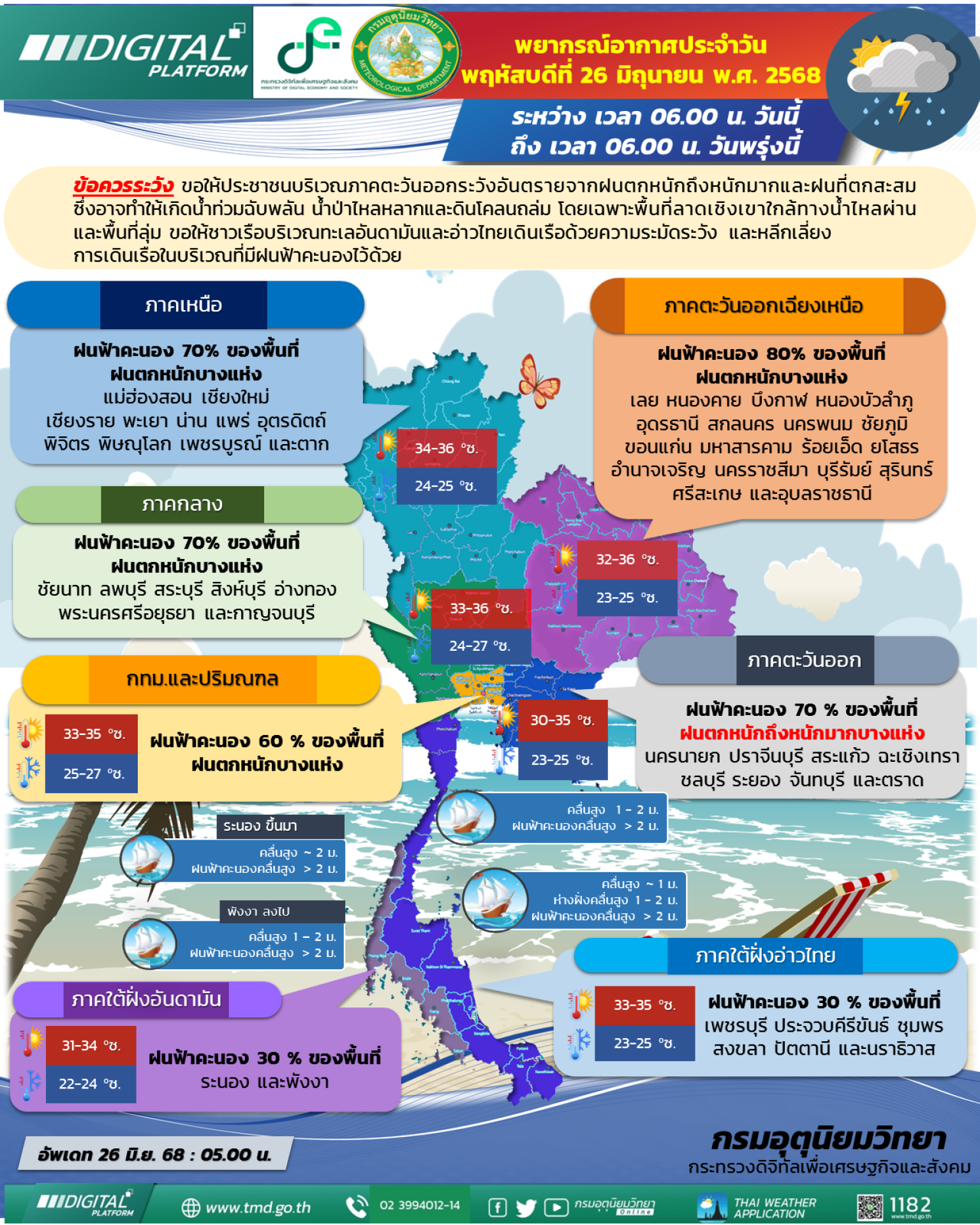 วันที่ 26 มิถุนายน 2568 ผู้สื่อข่าวรายงาน ว่า กรมอุตุนิยมวิทยา พยากรณ์อากาศ 24 ชั่วโมงข้างหน้า ประเทศไทยตอนบนมีการกระจายของฝนเพิ่มขึ้นและมีฝนตกหนักบางแห่ง โดยมีฝนตกหนักมากบางพื้นที่ในภาคตะวันออก ขอให้ประชาชนบริเวณดังกล่าวระวังอันตรายจากฝนตกหนักถึงหนักมากและฝนที่ตกสะสม ซึ่งอาจทำให้เกิดน้ำท่วมฉับพลัน น้ำป่าไหลหลากและดินโคลนถล่ม โดยเฉพาะพื้นที่ลาดเชิงเขาใกล้ทางน้ำไหลผ่านและพื้นที่ลุ่ม ทั้งนี้เนื่องจากร่องมรสุมพาดผ่านภาคเหนือตอนบนและภาคตะวันออกเฉียงเหนือตอนบน ประกอบกับมรสุมตะวันตกเฉียงใต้ที่พัดปกคลุมทะเลอันดามัน ประเทศไทย และอ่าวไทยมีกำลังปานกลาง