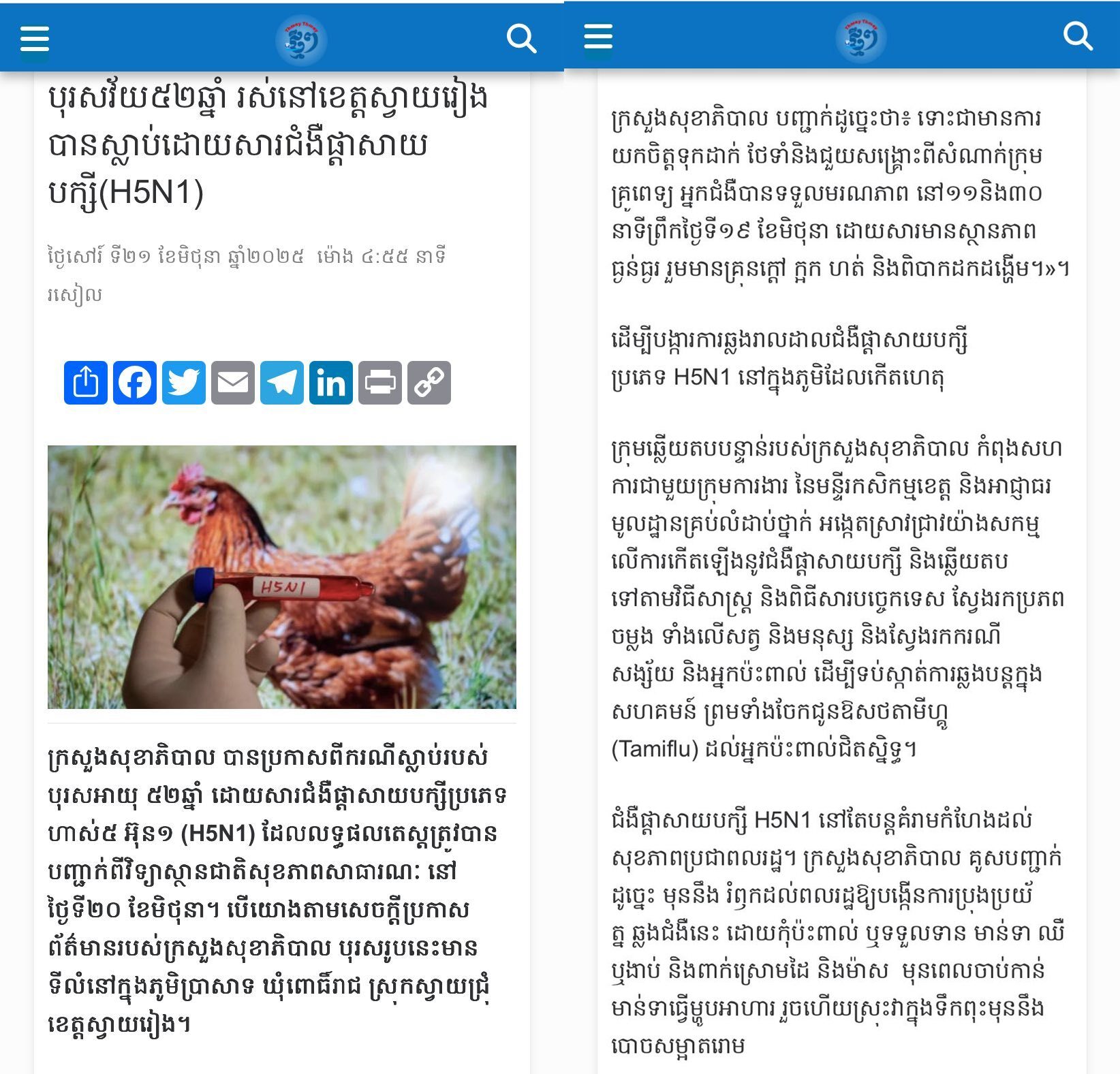อ่านข่าวต้นฉบับได้ที่ : ด่วน พบเชื้อไข้หวัดนก สายพันธุ์ H5N1 ระบาดในกัมพูชา พบดับแล้ว 1