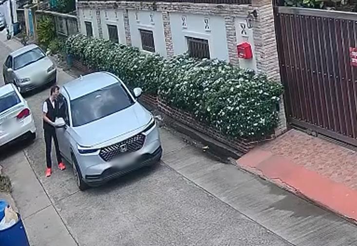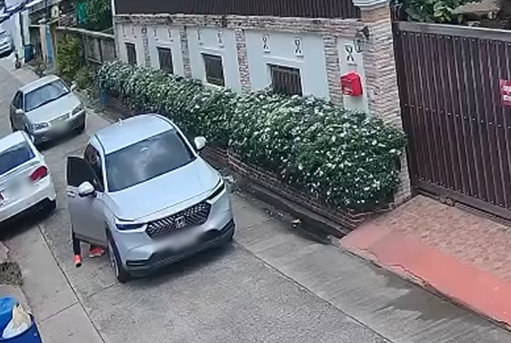 จากนั้นภาพกล้องวงจรปิด เวลา 10.55 น. จับภาพรถเก๋งและผู้ก่อเหตุลงจากประตูท้ายหลังคนขับ เพราะมีรถเก๋งมาจอดรอใช้ทาง ก่อนจะก้มเก็บอะไรอย่าง หลังจากนั้นผู้ก่อเหตุเดินอ้อมกลับไปนั่งฝั่งคนขับ แล้วขับรถไปจอดหลบข้างทาง รอจนรถคันหลัง ขับผ่านไป ผู้ก่อเหตุจึงถอยรถกลับมาจอด และเดินลงจากรถกลับเข้าบ้าน ก่อนจะเดินวนกลับมาดูรถหลายครั้ง ส่วนรถก็จอดติดเครื่องไว้ ไฟหน้ารถติดอยู่ จากนั้นมีเพื่อนบ้านมาพบและมีการพูดคุยกัน