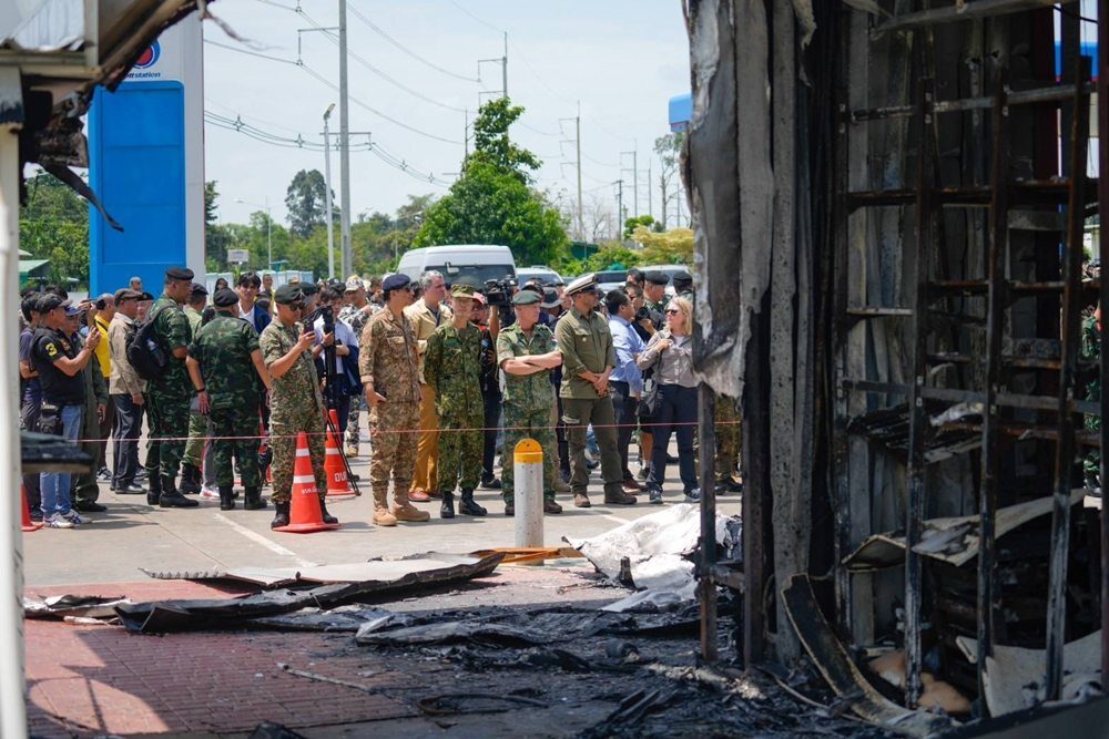 เมื่อวันที่ 1 ส.ค.68 ที่สถานีบริการน้ำมัน ปตท.บ้านผือ ต.หนองหญ้าลาด อ.กันทรลักษ์ จ.ศรีสะเกษ ศูนย์ประชาสัมพันธ์กองทัพบก (ศปส.ทบ.) และกระทรวงการต่างประเทศ นำคณะเอกอัครราชทูต อุปทูต ผู้แทน รวม 11 ประเทศ และผู้ช่วยทูตทหาร 23 ประเทศ สื่อมวลชน รวม 200 ชีวิต ดูความเสียหาย หลังทหารกัมพูชายิงจรวด BM-21 ใส่ร้านสะดวกซื้อ ทำให้ประชาชนคนไทยเสียชีวิต 8 ราย หนึ่งในนั้นเป็นเด็กอายุ 7-8 ปี บาดเจ็บอีก 10 คน