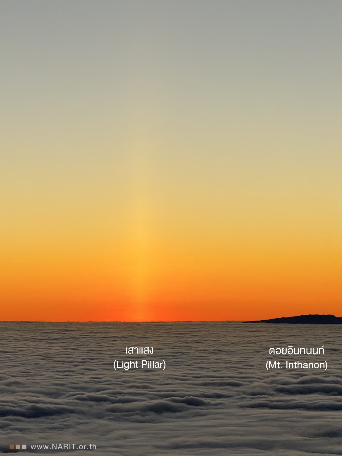 โดยภาพนี้บันทึกในช่วงเย็นวันที่ 16 ธ.ค.67 ขณะอยู่บนเครื่องบิน เส้นทางบินเชียงใหม่-ขอนแก่น มองเห็นปรากฏการณ์เสาแสงอยู่เหนือเมฆขึ้นไป ซึ่งในภาพมีดอยอินทนนท์อยู่ทางขวา อากาศบริเวณที่เกิดเป็น Sun Pillar นี้อยู่สูงกว่าความสูงยอดดอยเป็นอย่างมาก จึงเป็นเหตุให้เกิดผลึกน้ำแข็งได้ แม้ว่าอุณหภูมิบนพื้นไม่ได้หนาวมากเท่าไหร่นัก