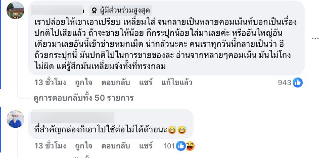 - เราปล่อยให้เขาเอาเปรียบ เหลี่ยมใส่ จนกลายเป็นหลายคอมเม้นท์บอกเป็นเรื่องปกติไปเสียแล้ว ถ้าจะขายให้น้อย ก็กระปุกน้อยใส่มาเลยค่ะ หรืออันใหญ่อันเดียวมาเลยอันนี้เข้าข่ายหมกเม็ด น่ากลัวนะคะ คนเราทุกวันนี้กลายเป็นว่า อีถ้วยกระปุกนี้ มันปกติไปในการขายของละ อ่านจากหลายๆคอมเม้น มันไม่โกงไม่ผิด แต่รู้สึกมันเหลี่ยมจังทั้งที่ทรงกลม