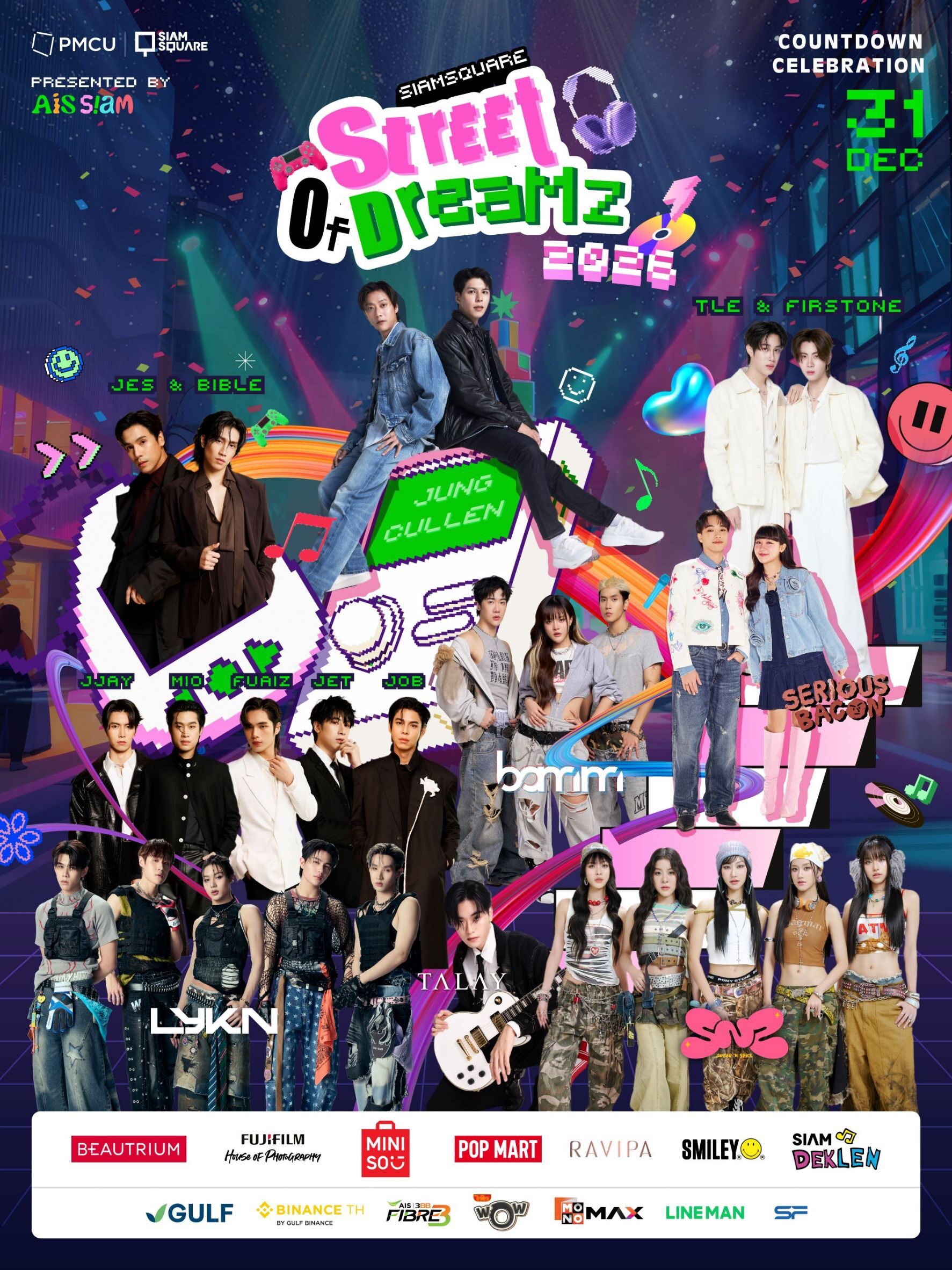 - ในคืนข้ามปี Countdown Celebration พบกับศิลปินชื่อดังมากมาย นำโดย พี่จอง คัลแลน, เจษ-ไบเบิ้ล, เติ้ล-เฟิร์สวัน, LYKN, SERIOUS BACON, Sugar ‘N Spice, bamm, TALAY พร้อมนับถอยหลังสู่ปี 2026 (วันพุธที่ 31 ธันวาคม 2568) เวลา 18.00 น. เป็นต้นไป