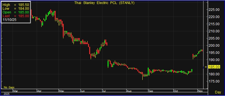 อัพเดต 10 พ.ย. 2568 เวลา 03.41 น. • เผยแพร่ 10 พ.ย. 2568 เวลา 03.41 น. • ข่าวหุ้นธุรกิจออนไลน์ผู้สื่อข่าวรายงานว่า วันนี้ (10 พ.ย.68) มีหลักทรัพย์ราคาหุ้นอ่อนตัวลงตามทฤษฎีเมื่อวันขึ้นเครื่องหมาย XD ซึ่งผู้ซื้อหลักทรัพย์ไม่ได้สิทธิรับเงินปันผล ทำให้ราคาหุ้นปรับตัวลดลง ล่าสุด ณ เวลา 10:32 น. ราคาหุ้น บริษัท ไทยสแตนเลย์การไฟฟ้า จำกัด (มหาชน) หรือ STANLY อยู่ที่ระดับ 185 บาท ลบ 11.00 บาท หรือ 5.61% สูงสุดที่ระดับ 185.50 บาท ต่ำสุดที่ระดับ 184 บาท ด้วยมูลค่าการซื้อขาย 2.91 ล้านบาท