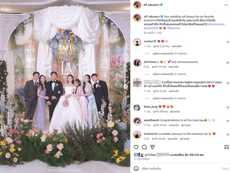 “Your wedding will always be my favorite มากกว่าการได้เห็นลูกน้ำ&อลันรักกัน แต่งงานกัน คือการได้เห็นครอบครัวที่น่ารักทั้งสองครอบครัวได้ผูกพันธ์กันตลอดไป @looknumm @alan5559 #Fallininla”