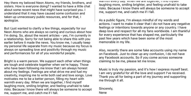 “ฉันแค่อยากจะชี้แจงบางสิ่ง โดยเฉพาะอย่างยิ่งสำหรับแฟนๆ ของเราที่คอยเอาใจใส่ และอยากรู้ว่าฉันเป็นยังไงบ้างอยู่เสมอ เกี่ยวกับข่าวลือล่าสุด ใช่ ตอนนี้ฉันกำลังคบกับไบร์ทอยู่ ขออภัยที่ไม่สามารถแชร์สิ่งนี้กับคุณก่อนหน้านี้ ก่อนที่จะมีข่าว คุณรู้ไหม ฉันมักจะแยกชีวิตส่วนตัวของฉันออกจากดนตรี เพราะว่าฉันมุ่งเน้นไปที่การเผยแพร่ความรัก และความคิดเชิงบวกผ่านดนตรี และการแสดงของฉันให้กับทุกคนที่ยอดเยี่ยมทุกคน”