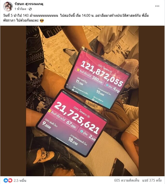 เจนนี่ ยังโพสต์ปิดยอดล่าสุดด้วยว่า “วันที่ 5 ปาไป 143 ล้านนนนนนนนนนน ไปต่อวันนี้ เริ่ม 14.00 น. อย่าลืมมาสร้างประวัติศาสตร์กับ พี่อั้ม พัชราภา ไปด้วยกันนะคะ ”