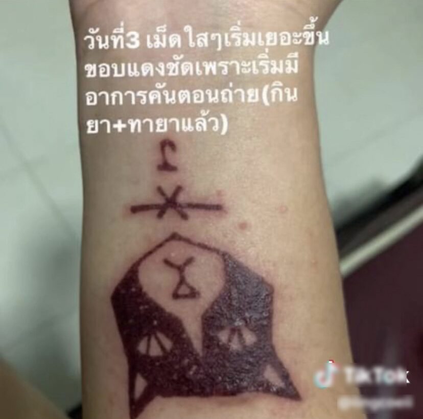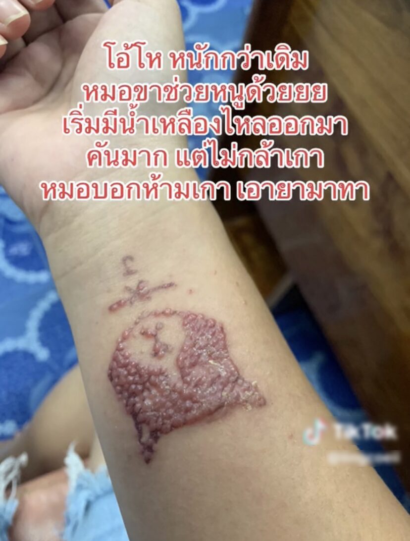 บริเวณรอยเพนต์มีตุ่มใส่ขึ้นเป็นเม็ดเบียดแน่นกันเป็นจำนวนมาก ลักษณะคล้ายแผลพุพอง และอาการหนักขึ้นกว่าเดิม เริ่มมีน้ำเหลืองไหลออกมาจากแผล ทั้งยังมีอาการคันมาก จนตัดสินใจไปพบแพทย์ เพื่อเข้ารับการรักษา