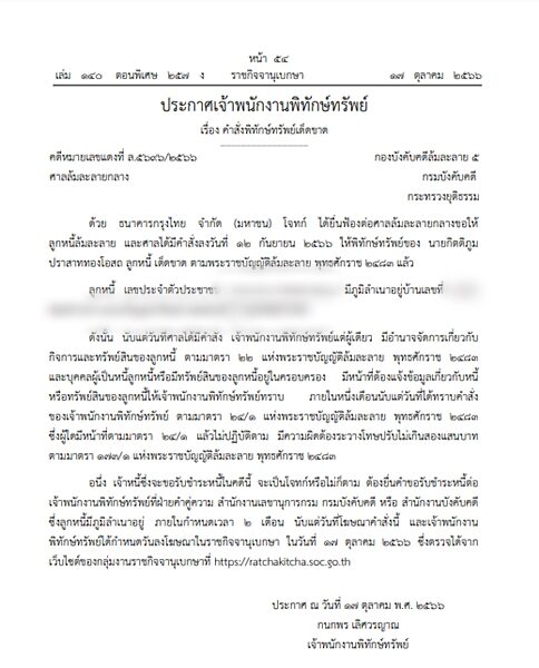 ราชกิจจาฯ เผยแพร่ประกาศเจ้าพนักงานพิทักษ์ทรัพย์ หลังศาลสั่งพิทักษ์ทรัพย์เด็ดขาด บุคคลนามสกุลดัง ถูกธนาคารกรุงไทยยื่นฟ้องล้มละลาย