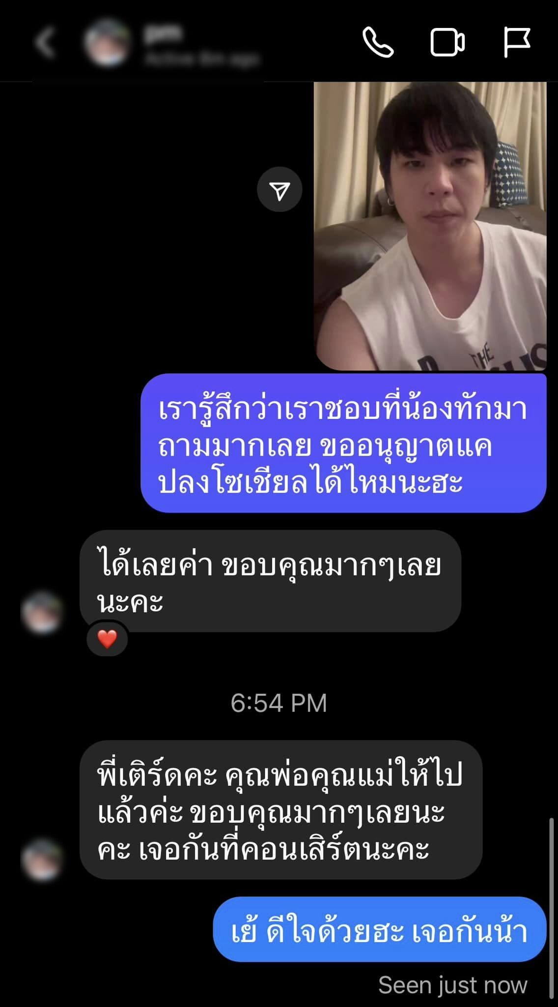 "เลยจะทำสไลด์ บอกข้อมูลของวงและของคอนเสิร์ตให้พ่อ-แม่ และทักมาขอให้เราถ่ายคลิปบอก คุณพ่อ-คุณแม่ให้หน่อย ฮืออออ แล้วน้องได้มาแล้ว"