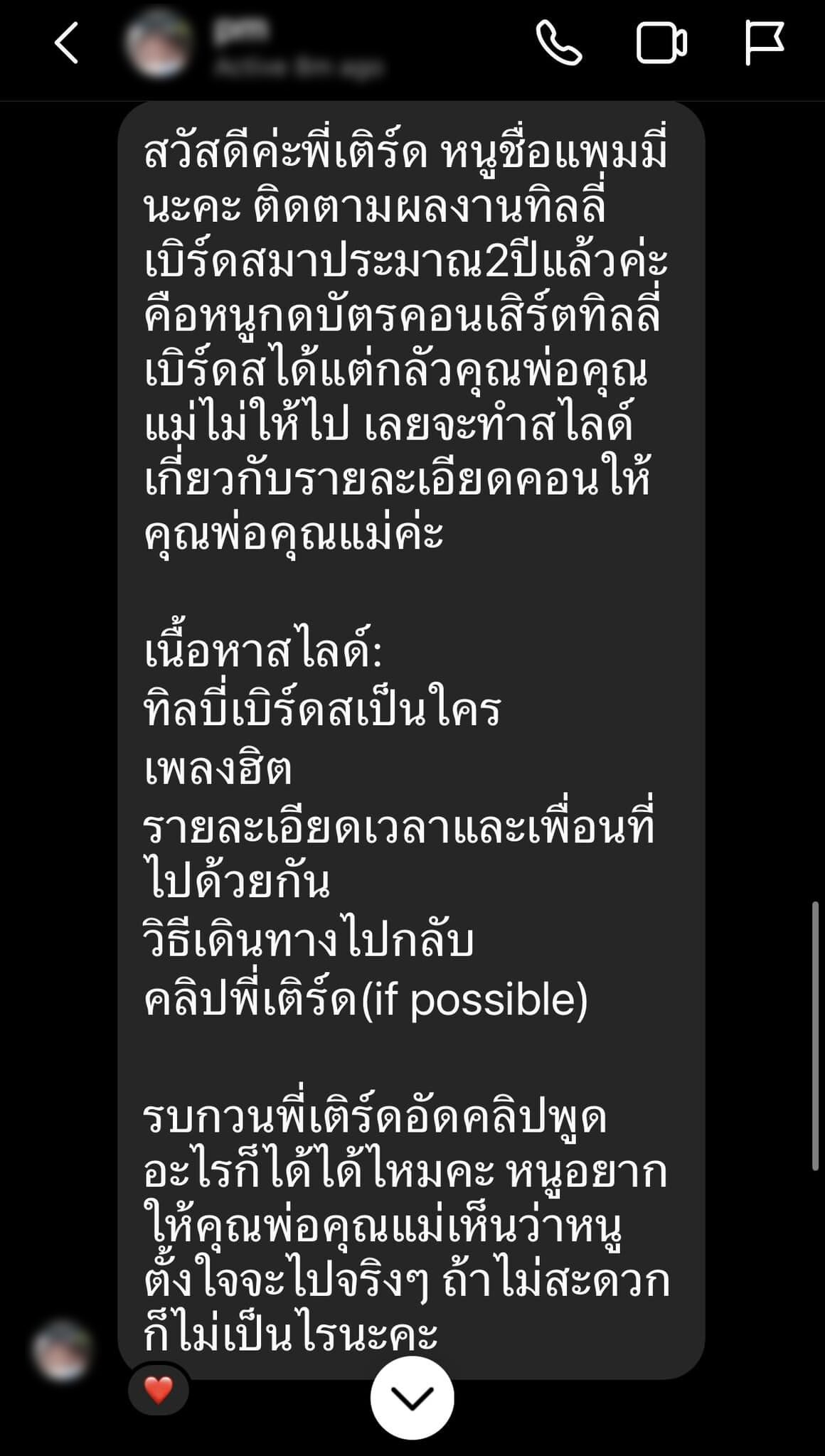 'เติร์ด Tilly Birds' ใจฟู แฟนคลับตัวน้อย กลัวพ่อ-แม่ ไม่ให้ไปคอนเสิร์ต ทักแชทอินสตาแกรมขอภาพวิดีโอ เพื่อทำพรีเซนต์ขอพ่อ-แม่ไปคอนเสิร์ต