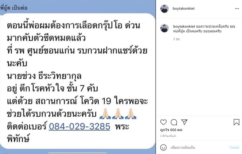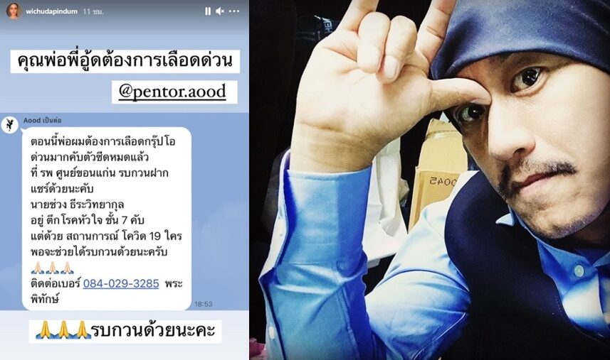 คนบันเทิงช่วยแชร์อู๊ดขอความช่วยเหลือพ่อตัวซีดหมดแล้วต้องการเลือดด่วน บอย ถกลเกียรติ โพสต์ข้อความ ขอความช่วยเหลือครับ คุณพ่อพี่อู๊ด เป็นต่อครับ ขอบคุณครับ โดยมีข้อความของ อู๊ด เป็นต่อ แจ้งว่า ตอนนี้พ่อผมต้องการเลือดกรุ๊ปโอ ด่วนมากคับตีวซีดหมดแล้ว ที่รพศูนย์ขอนแก่น รบกวนฝากแชร์ด้วยนะคับ นายช่วง ธีระวิทยากุล อยู่ตึกโรคหัวใจชั้น7 คับ แต่ด้วยสถานการณ์โควิด-19 ใครพอจะช่วยได้รบกวนด้วยนะครับ ติดต่อเบอร์ 084-029-3285 พระพิทักษ์