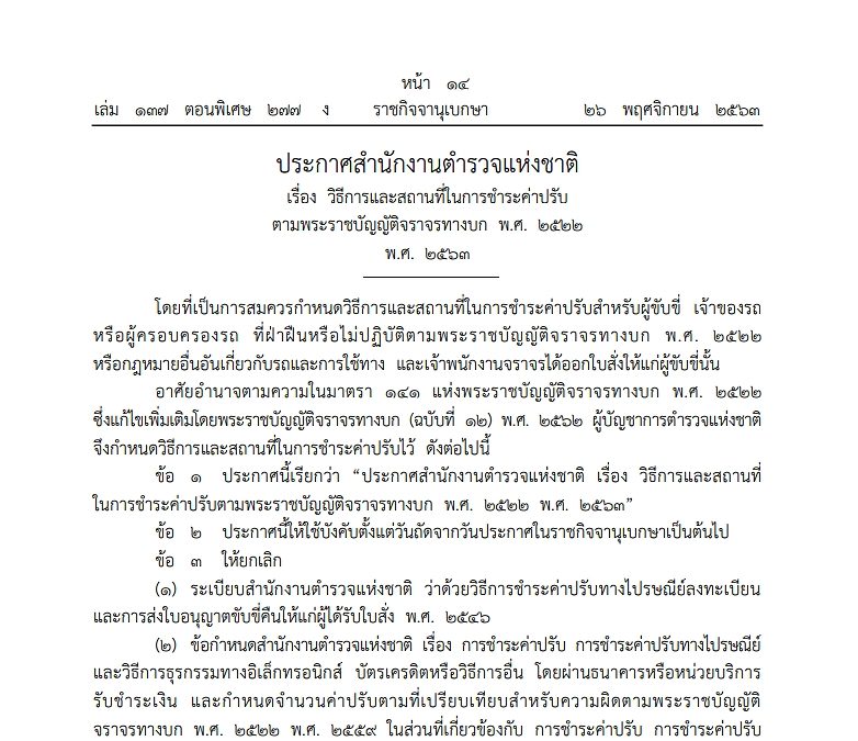 ราชกิจจาฯ เผยแพร่ประกาศสำนักงานตำรวจแห่งชาติ ล่าสุด วิธีการและสถานที่ในการชำระค่าปรับ ตาม พ.ร.บ.จราจรทางบก พ.ศ.2522 พ.ศ.2563