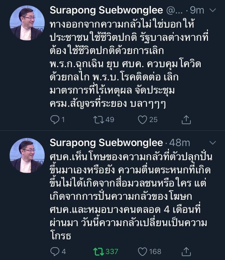 ศบค.เห็นโทษของความกลัวที่ตัวปลุกปั่นขึ้นมาเองหรือยัง ความตื่นตระหนกที่เกิดขึ้นไม่ได้เกิดจากสื่อมวลชนหรือใคร แต่เกิดจากการปั่นความกลัวของโฆษก ศบค.และหมอบางคนตลอด 4 เดือนที่ผ่านมา วันนี้ความกลัวเปลี่ยนเป็นความโกรธ