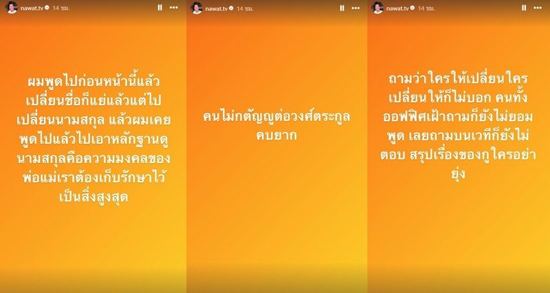 “ผมพูดไปก่อนหน้านี้แล้ว เปลี่ยนชื่อก็แย่แล้ว แต่ไปเปลี่ยนนามสกุล แล้วผมเคยพูดไปแล้ว ไปเอาหลักฐานดู นามสกุลคือความมงคลของพ่อแม่เรา ต้องเก็บรักษาไว้เป็นสิ่งสูงสุด”