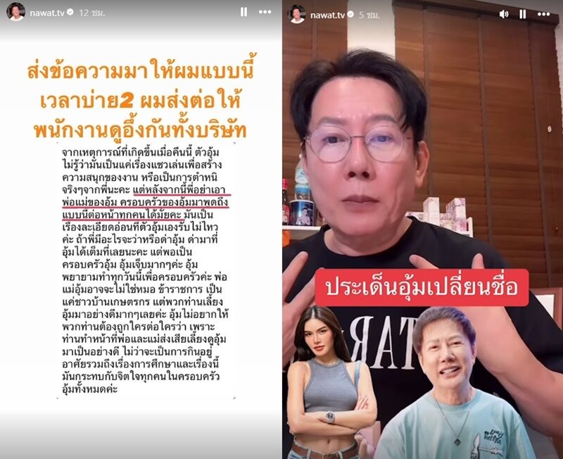 อ่านข่าวต้นฉบับได้ที่ : เดือด ณวัฒน์ - อุ้ม ทวีพร ปรี๊ดสั่งบอสอย่าพูดถึงพ่อแม่ ฟาดเปลี่ยนชื่อสันดานเปลี่ยน