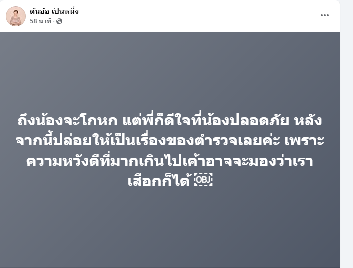 และโพสต์อีกว่า "ถึงน้องจะโกหก แต่พี่ก็ดีใจที่น้องปลอดภัย หลังจากนี้ปล่อยให้เป็นเรื่องของตำรวจเลยค่ะ เพราะความหวังดีที่มากเกินไปเค้าอาจจะมองว่าเราเสือกก็ได้"