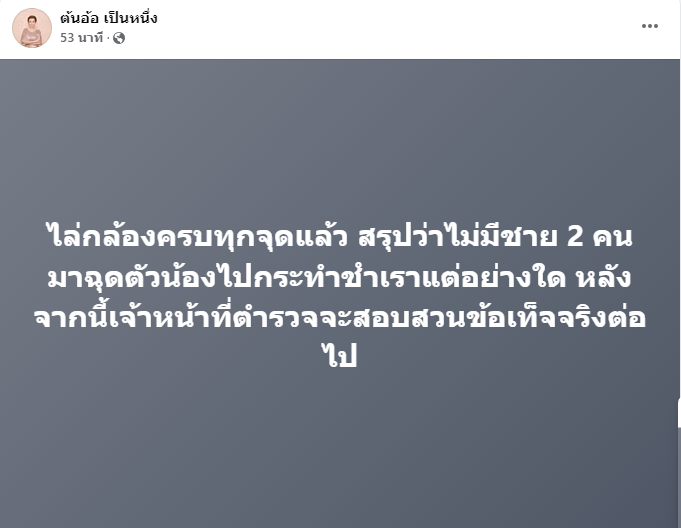 สำหรับความคืบหน้าล่าสุด วันที่ 7 ม.ค.68 ต้นอ้อ เป็นหนึ่ง คนที่เข้าไปช่วยเหลือ โพสต์ข้อความในเฟซบุ๊กว่า "ไล่กล้องครบทุกจุดแล้ว สรุปว่าไม่มีชาย 2 คนมาฉุดตัวน้องไปกระทำชำเราแต่อย่างใด หลังจากนี้เจ้าหน้าที่ตำรวจจะสอบสวนข้อเท็จจริงต่อไป"