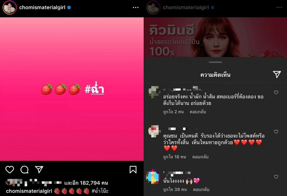 บ้างก็มองว่าคงเป็นการโปรโมทอะไรบางอย่างอีกตามเคยรึเปล่า เพราะสาว ชมพู่ ก็เคยโพสต์แนวๆนี้ อย่างตอน สตรอว์เบอร์รี่ 3 ลูก พร้อม #ฉ่ำโน๊ะ จนแฟนคลับพากันมาแห่คอมเมนต์ถามมีดราม่าอะไรหรือเปล่า สุดท้ายก็เป็นเพียงการโปรโมทสินค้าที่ตัวเองเป็นพรีเซ็นเตอร์เท่านั้น