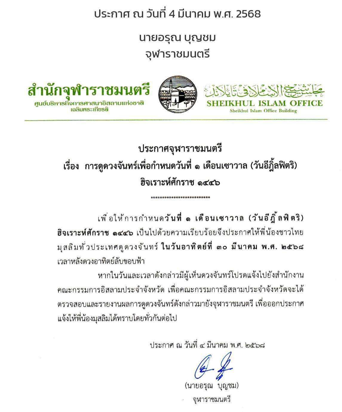 นับถอยหลังไปอีกเพียง 3 วัน ก็จะถึงเทศกาลฮารีรายอ หรือวันตรุษอีฎิ้ลฟิตริ ประจำปีฮิจเราะห์ศักราช 1446 หลังจากที่มุสลิมทั่วโลกปฏิบัติศาสนกิจถือศีลอดในเดือนรอมฎอนเป็นเวลา 1 เดือนเต็ม ตั้งแต่วันที่ 2 มี.ค.68 และในวันที่ 30 มี.ค.68 ที่จะถึงนี้ ทางสำนักจุฬาราชมนตรี ได้ประกาศให้ชาวไทยมุสลิมทั่วประเทศ ดูดวงจันทร์เวลาหลังดวงอาทิตย์ลับขอบฟ้า เพื่อกำหนดวันที่ 1 เดือนเซาวาล (วันอีฎิ้ลฟิตริ) หากมีผู้เห็นดวงจันทร์ ในวันที่ 31 มี.ค.68 ก็จะเป็นวันอีฎิ้ลฟิตริ หากไม่มีผู้เห็นดวงจันทร์ ในวันอังคารที่ 1 เม.ย.68 ก็จะเป็นวันอีฎิ้ลฟิตริ ซึ่งทางสำนักจุฬาราชมนตรี จะประกาศให้พี่น้องมุสลิมได้ทราบทั่วถึงกัน