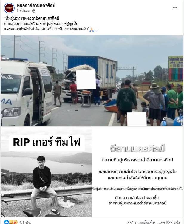 โดยระบุว่า “ทีมผู้บริหารหมอลำอีสานนครศิลป์ ขอแสดงความเสียใจอย่างสุดซึ้งต่อการสูญเสีย และขอส่งกำลังใจให้ครอบครัวและทีมงานทุกคนครับ””