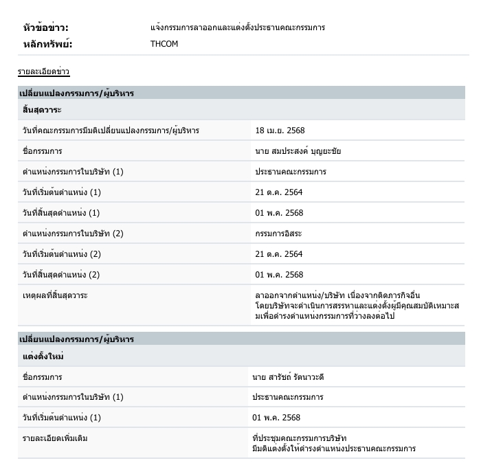 สารัชถ์ รัตนาวะดี ขึ้นประธานบอร์ด THCOM หลัง “สมประสงค์ บุญยะชัย” ยื่นลาออก มีผลตั้งแต่ 1 พ.ค. 68