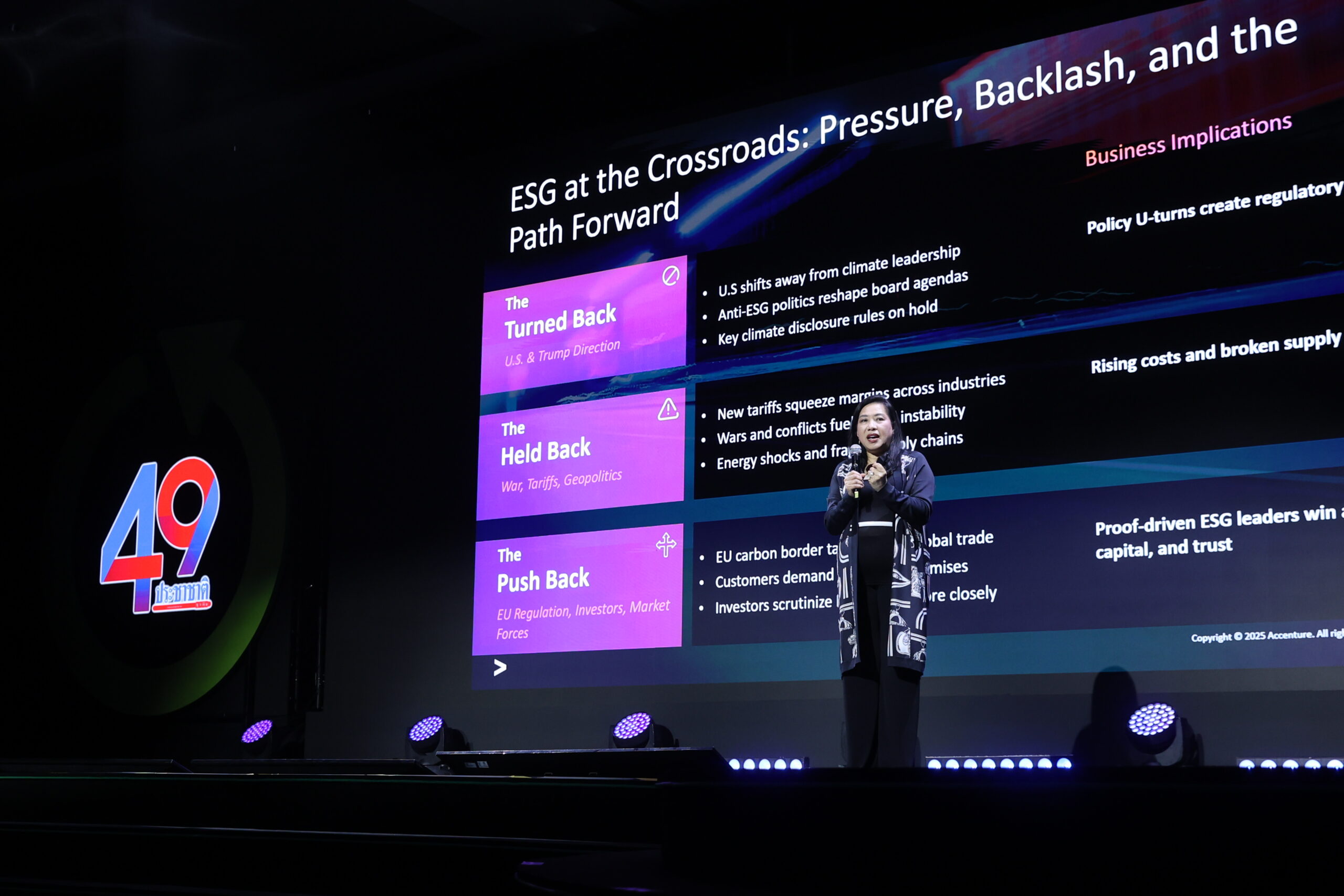 นางสาวปฐมา จันทรักษ์ กรรมการผู้จัดการ เอคเซนเชอร์ ประเทศไทย กล่าวในงานสัมมนา PRACHACHAT ESG FORUM 2025 The TURNING POINT #ตีแตก sustainability ว่า ช่วงที่ผ่านมามีหลายเหตุการณ์เกิดขึ้น และทำให้คำว่า “ESG” ถูกตั้งคำถามถึงการปฏิบัติจริง เช่น การตั้งกำแพงภาษีตอบโต้ และการขับเคลื่อนนโยบายของสหรัฐที่ลดบทบาทเรื่อง Climate Leadership เป็นต้น