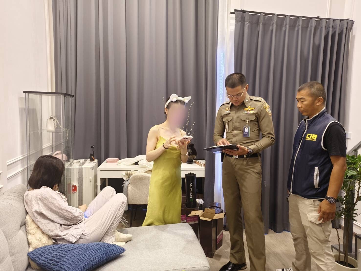 พร้อมของกลางแก๊สหัวเราะ หรือแก๊สไนตรัสออกไซด์ 50 กระบอก และน.ส.ถิ หรือ Ms.TRAN THI อายุ 31 ปี สัญชาติเวียดนาม พร้อมของกลางแก๊สหัวเราะ หรือแก๊สไนตรัสออกไซด์ 12 กระบอก โดยจับกุม นายยู้ ได้ที่ลานจอดรถสนามฟุตบอลหญ้าเทียม แขวงจอมพล เขตจตุจักร กรุงเทพมหานคร ส่วน น.ส.ถิ ถูกจับกุมตัวได้ที่คอนโดแห่งหนึ่ง ย่าน ถ.ประชาราษฎร์บำเพ็ญ แขวงและเขตห้วยขวาง กรุงเทพมหานคร